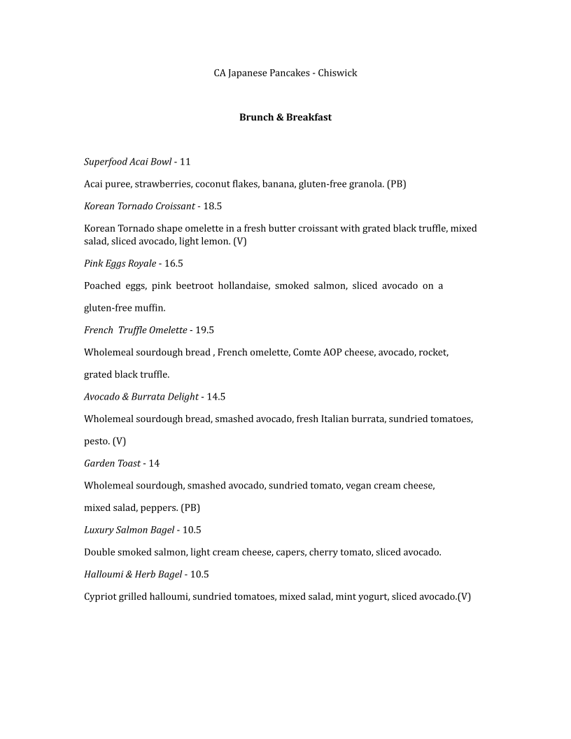 CA Japanese Pancakes in Chiswick offers a delightful brunch experience centered around their signature fluffy Japanese soufflé pancakes. These light, airy treats come in classic options topped with butter, maple syrup, and homemade whipped cream, or indulgent varieties like the Red Fruit and Cream with fresh raspberries and strawberry cream. Beyond pancakes, the menu shines with creative dishes such as the Korean Tornado Croissant, featuring a truffle-infused omelette paired with avocado and citrus, and the Pink Eggs Royale, which balances poached eggs and smoked salmon on a gluten-free muffin with vibrant beetroot hollandaise.